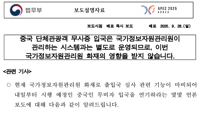 [법무부] 중국 단체관광객 무사증 입국은 국가정보자원관리원이 관리하는 시스템과는 별도로 운영되므로, 이번국가정보자원관리원 화재의 영향을 받지 않습니다.