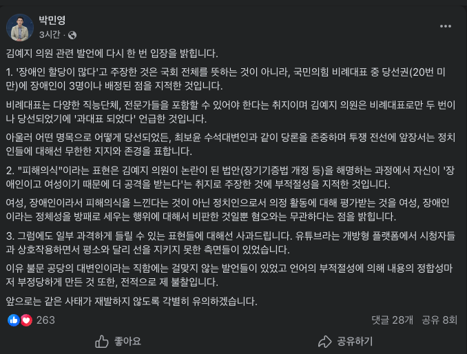 이렇게 되니... 뭐라 해도 결국 비난은 국민의힘에게 가고... 박민영 대변인에게 향한 비난은 수그러들지 않으니... 페이스북에 입장을 냈더군요...