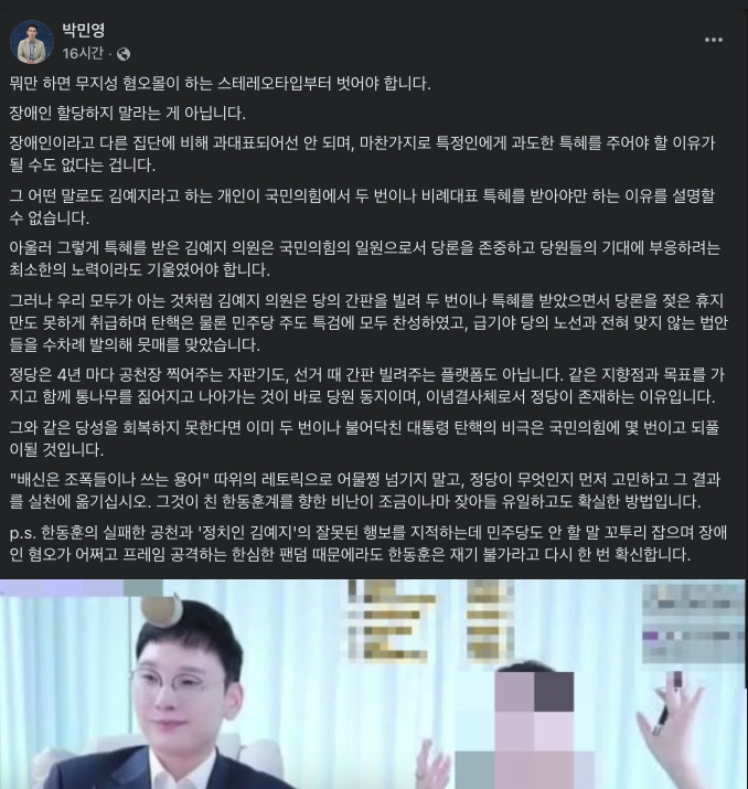 또 "한동훈의 실패한 공천과 '정치인 김예지'의 잘못된 행보를 지적하는데 민주당도 안 할 말을 꼬투리 잡으며 '장애인 혐오가 어쩌고' 프레임 공격하는 한심한 팬덤 때문에라도 한동훈은 재기 불가라고 다시 한번 확신한다"라고 덧붙였다. 박 대변인에 대한 고발을 예고한 유튜버가 친한동훈 성향이라는 점을 들어 비판한 것이다.